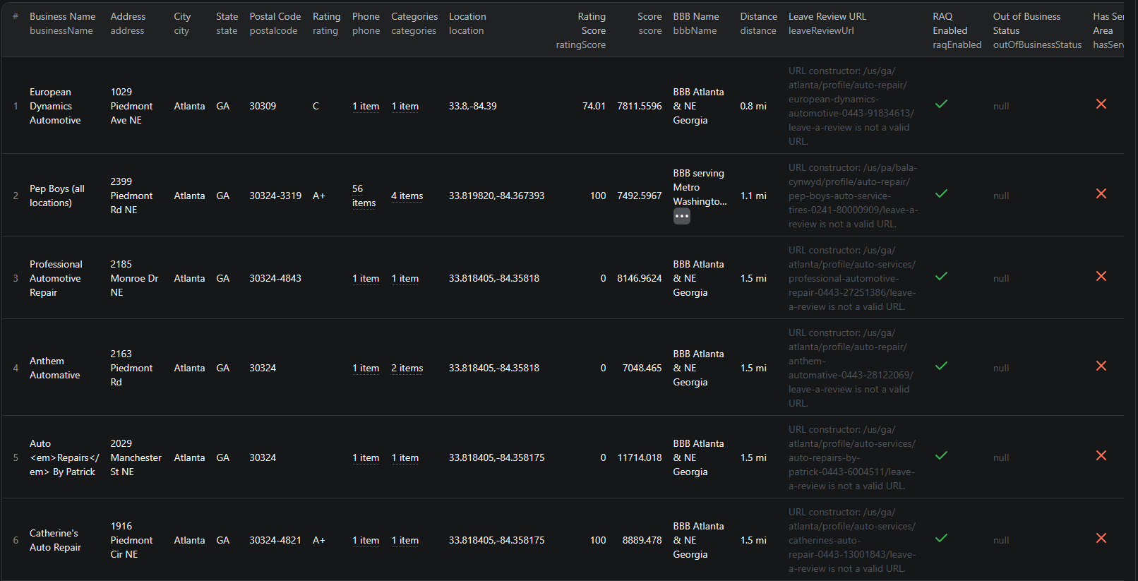 Here is what the actual output looks like from the BBB Advanced Scraper. Each business listing returns a structured JSON object: