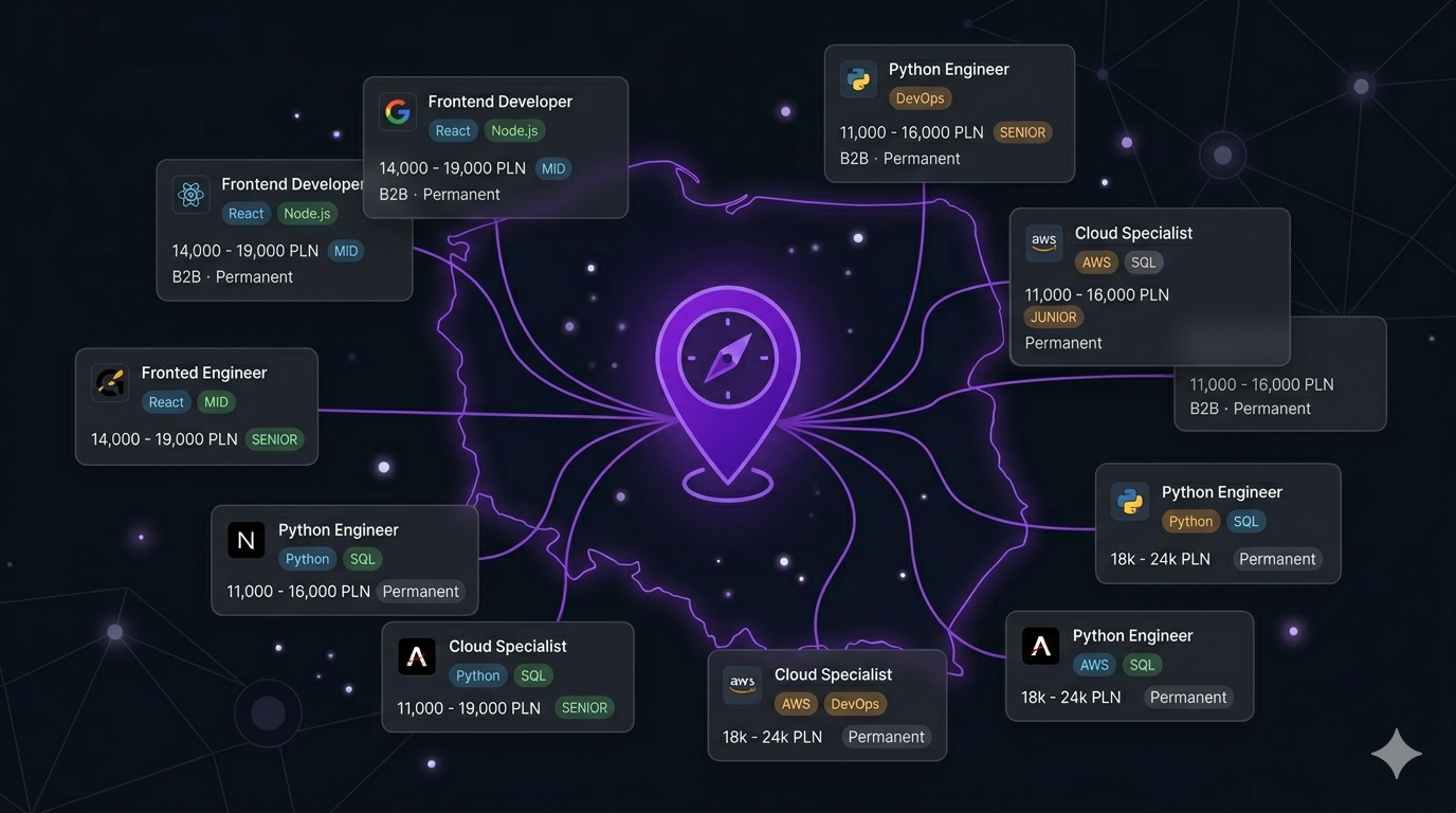 - Salary benchmarking — analyze compensation ranges across roles, experience levels, and contract types in the Polish market