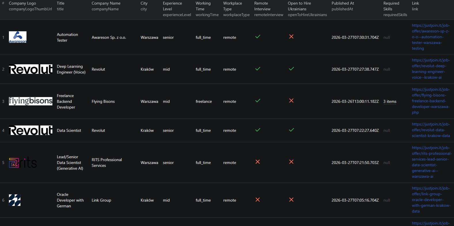 This is the kind of structured data that would take hours to compile manually. With a scraper, you can extract thousands of Polish tech job listings in minutes.