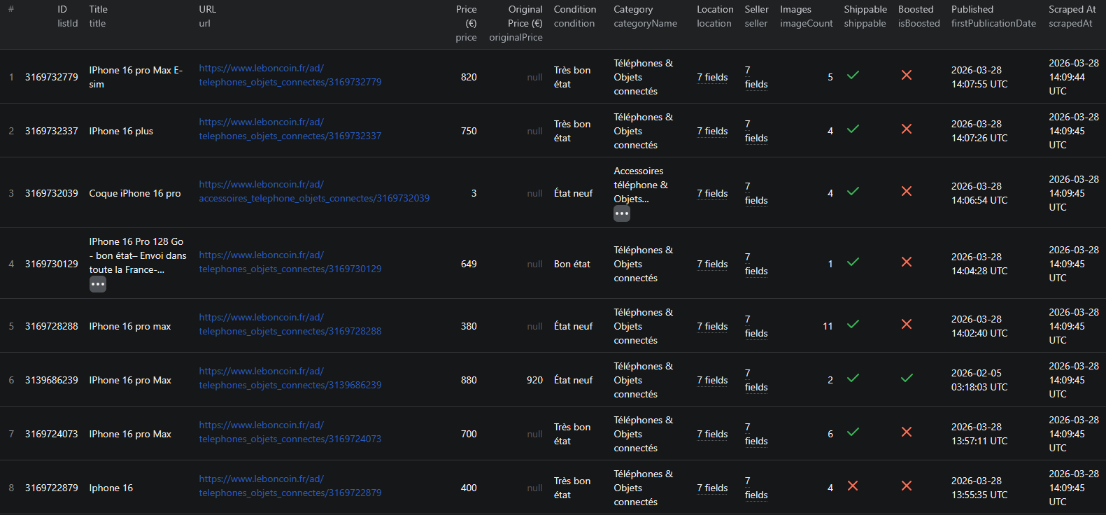 - Category-specific fields — each Leboncoin category has its own set of structured attributes (vehicle specs, property features, bike type, clothing size). Parsing these consistently from raw HTML is complex